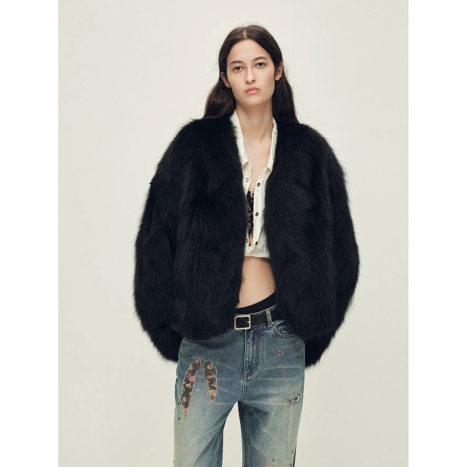 This coat is crafted from imported SAGAFURS Crown-grade fox fur — luxuriously light, warm, and elegantly fluid. Featuring artisan hand-dyed and two-tone ombré work, it's designed with a V-neck, dropped shoulder, and relaxed straight cut for easy layering and effortless comfort.