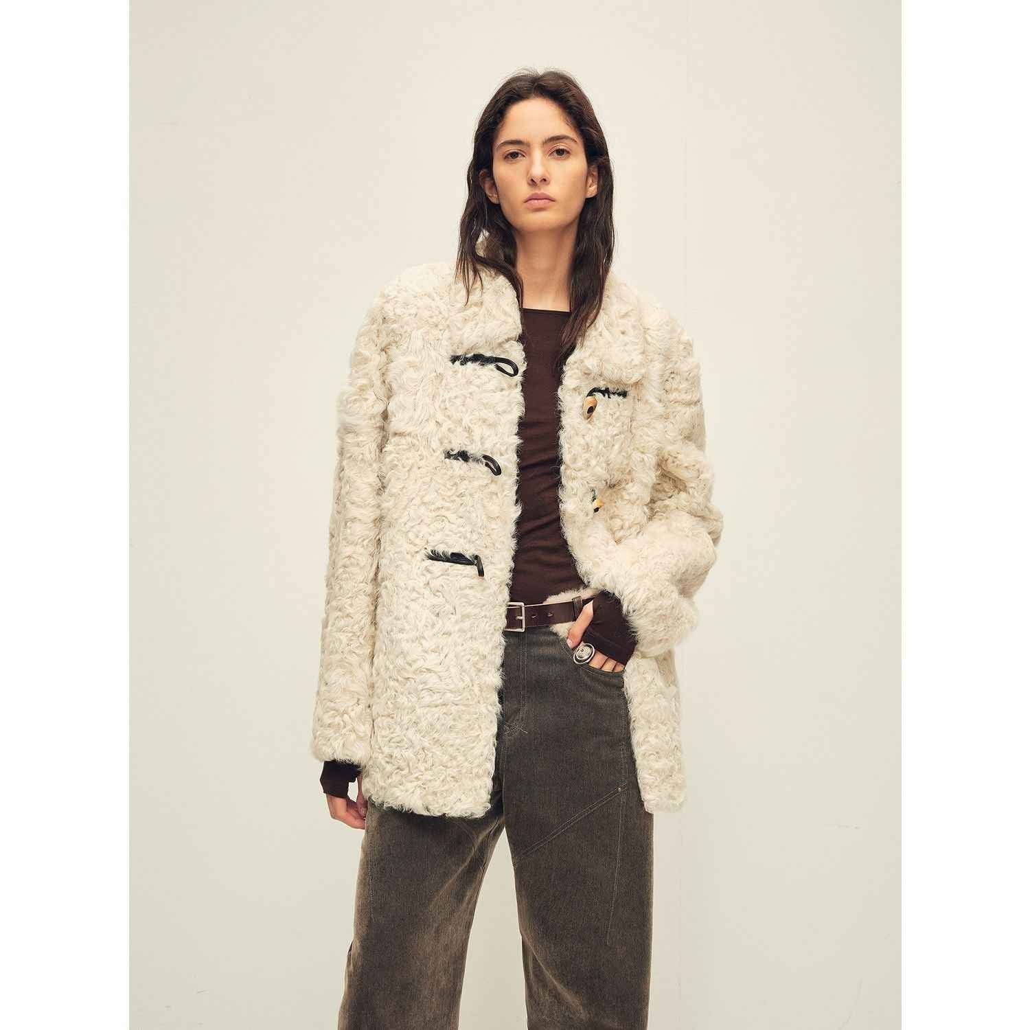 Firelady Fur Women's Sheepskin Wool Coat - Water Ripple Pattern Horn Button Mid-Length Jacket "Moro Garden"