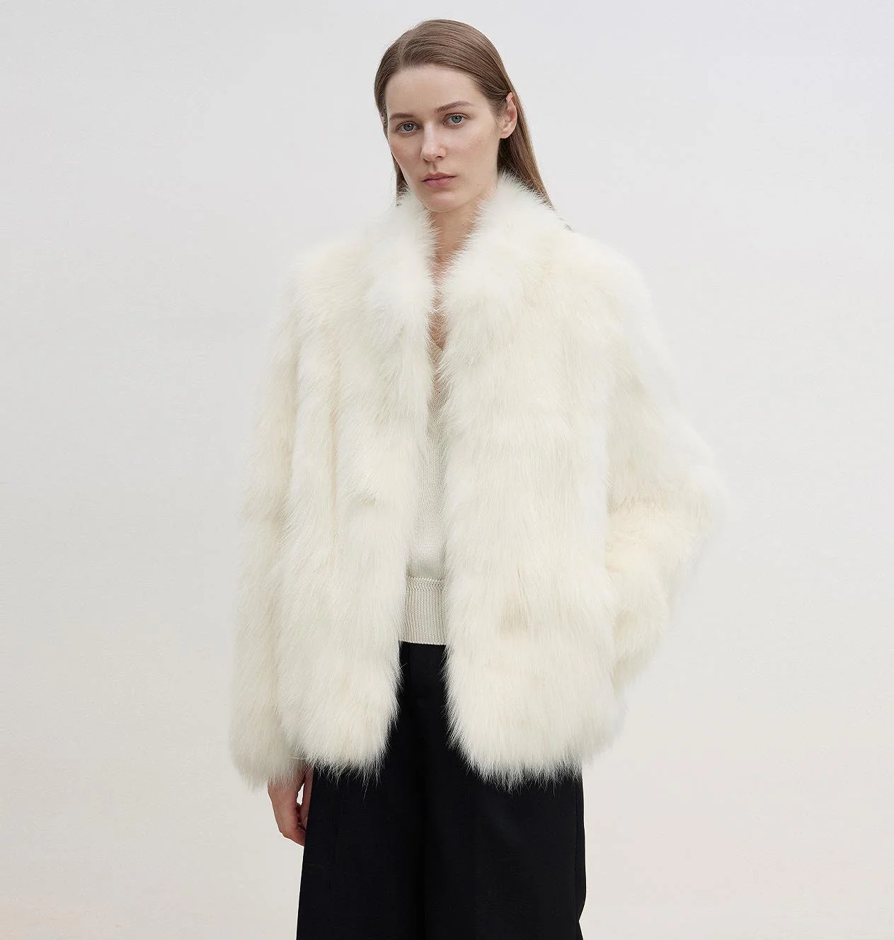 Imported high-quality fox fur is selected. The fur is long and thick, rich and elegant. It has an elegant and romantic temperament. The high and low fur texture is smart and fashionable. The shape is full and high-reach, and it interprets the retro and gorgeous light luxury texture. The one-hand length is matched with a close-fitting small stand-up collar, which fits the curve of the shoulder and neck. It is warm, stylish, and loose.