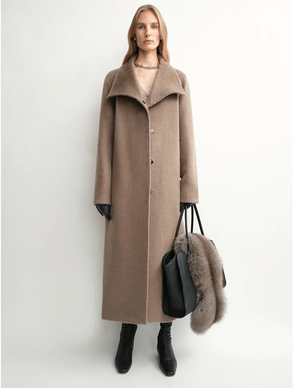 Premium Alpaca & Wool Blend Fabric – Long, abundant alpaca fibers combined with fine sheep's wool create a delicate, warm, and luxuriously soft texture. Exclusive custom brushing process delivers a fluffy, fur-like finish with sophisticated drape