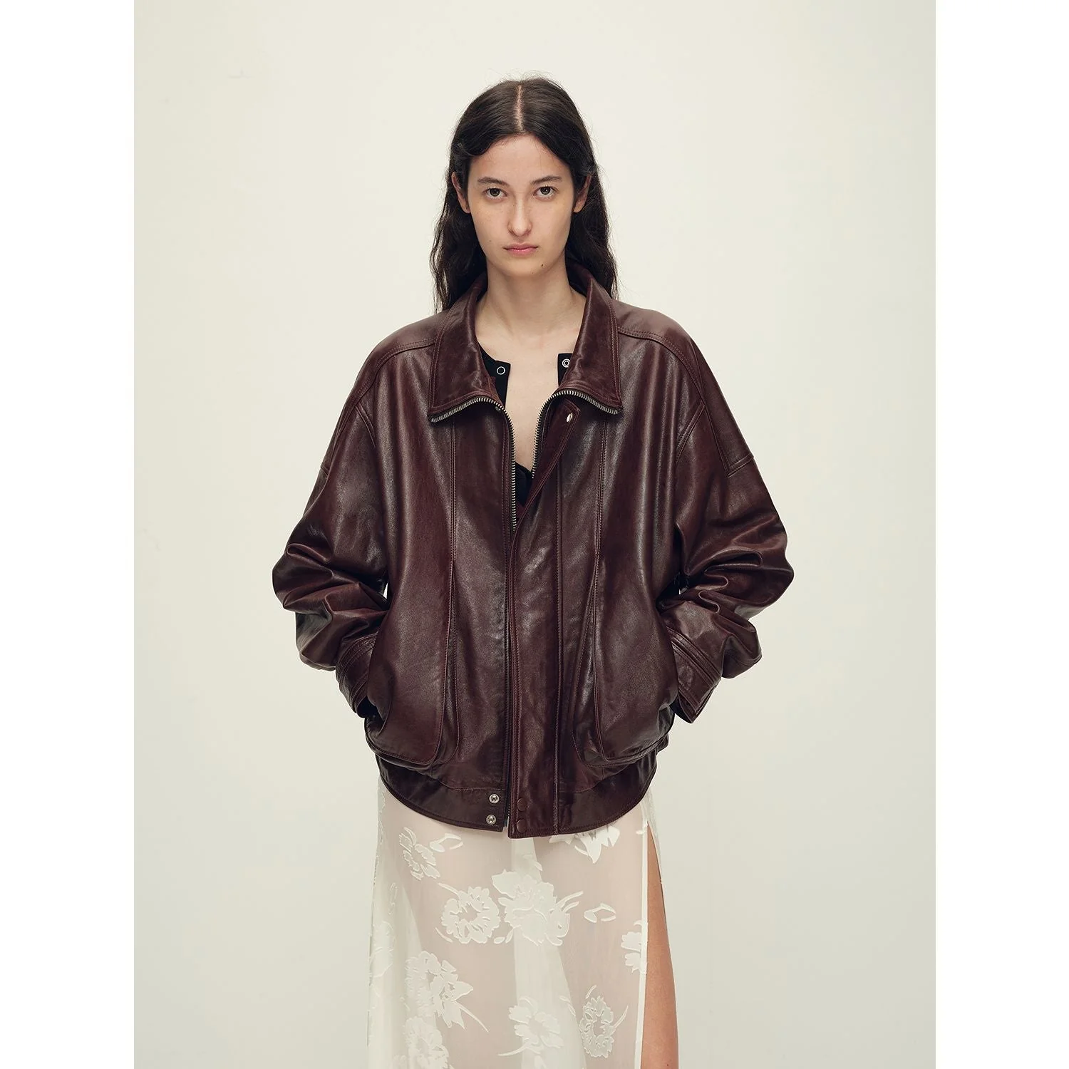 Firelady Fur Vintage Waxed Sheepskin Oversized Stand Collar Leather Jacket "Flight Notes"